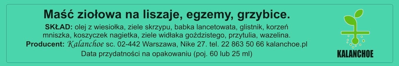 SKŁAD: olej z wiesiołka, ziele skrzypu, babka lancetowata, glistnik, korzeń mniszka, koszyczek nagietka, ziele widłaka goździstego, przytulia, wazelina biała.